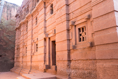 The courtyard area on the level ground surrounding the edges of the hollowed out pit where the church is located was filled with people, men, women and children all draped in white while a priest preached a sermon in a very loud carrying voice from a rise of higher ground. Everyone was quiet and very politely moved out of the way as we threaded our way towards the set of steps that led down to the church. Since the insides of the churches are spaces hollowed out of the central block of rock with few windows they are very dark and very little can be seen without some form of illumination. Therefore when we reached the door to the church at the bottom of the dugout, nothing could be seen inside the church but vague shapes and the crowd inside was sensed more than seen.