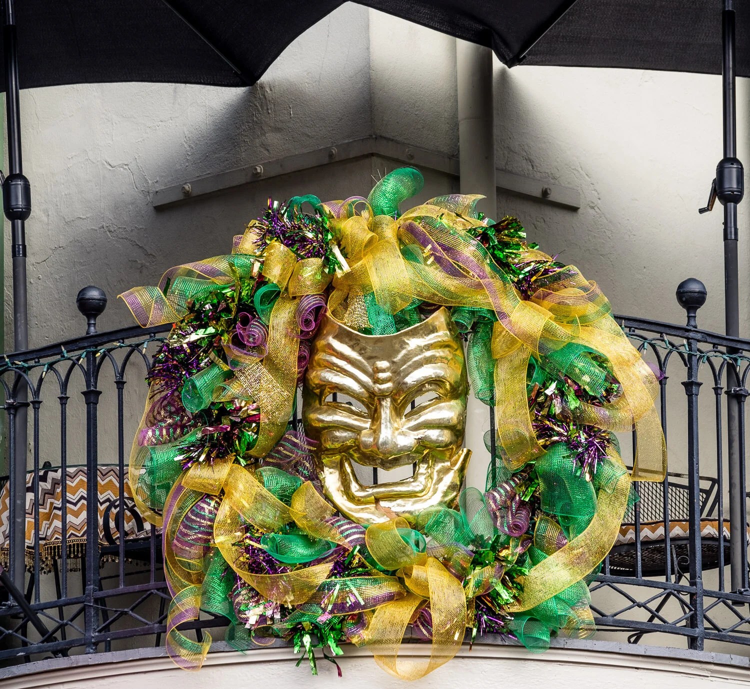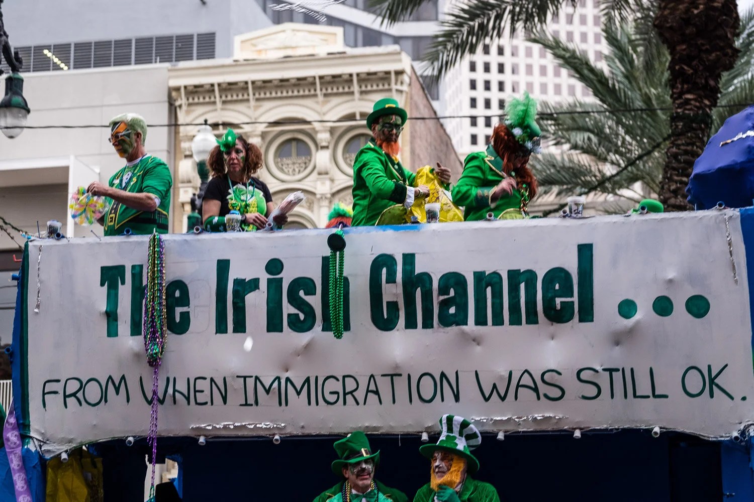 It’s a non-stop party, the sidewalk counters and take-out windows selling drinks are ready to go as early as anyone wants to order a drink and massive hangovers are launched whose foundations are being built before the rest of us have had breakfast. Surprisingly, the crowds are, for the most part, very well-behaved and generous. One of the features of the festival is the continual rain of bead necklaces, in their thousands, that are thrown to the crowds from the floats and these beads are coloured with the MG colours, purple gold and green, or with the colours and insignia of the patron persona of the particular krew. There is intense competition to catch as many of these necklaces as possible and people can be seen in the crowds and walking the streets with massive quantities of these necklaces strung around their neck, a field day for chiropractors in the days and weeks following MG. V has had numerous people offer to share some of their necklaces with her if she missed a throw that was caught by someone else and everyone is very relaxed about making room at the front for others to see better.