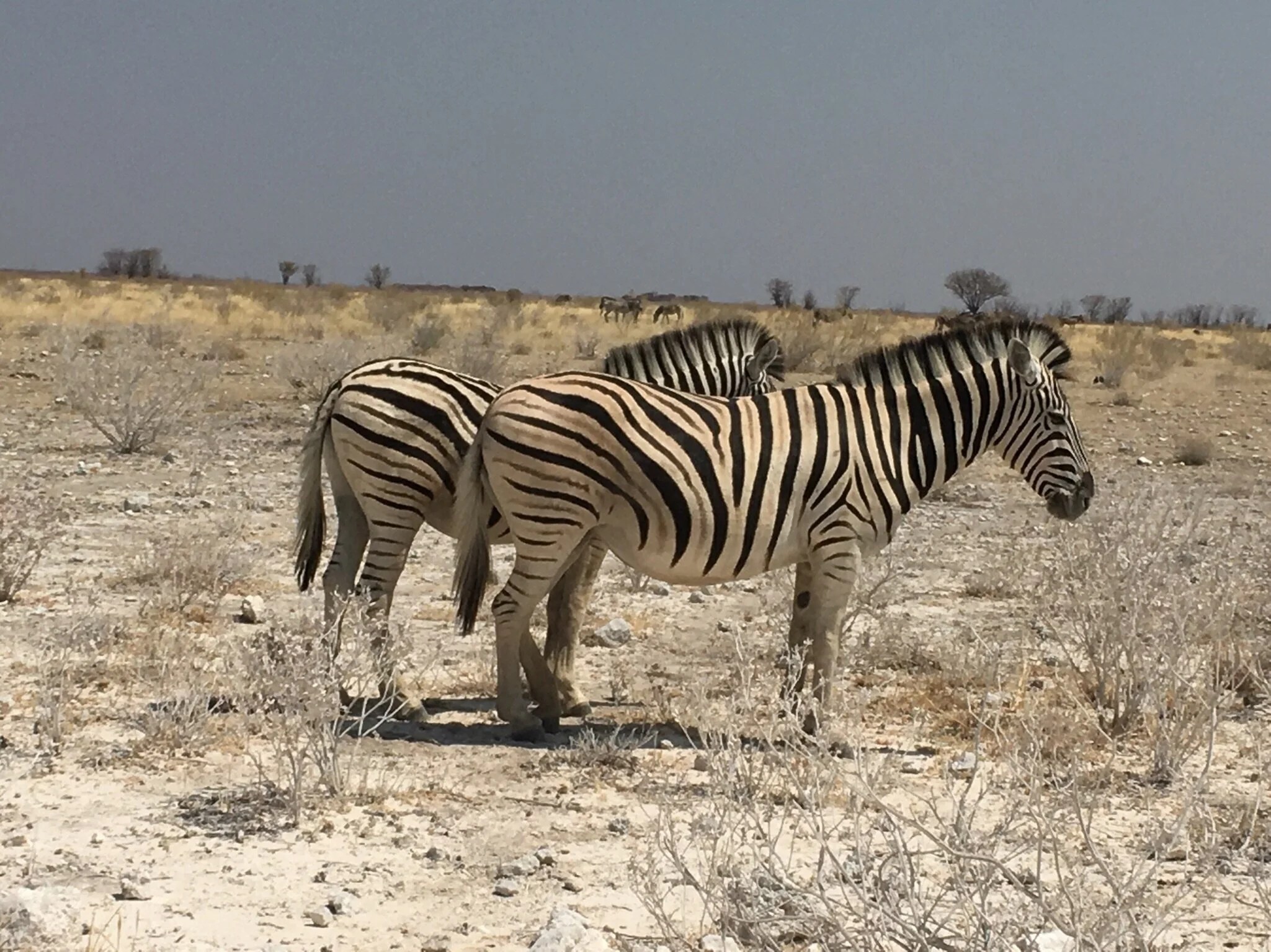 Mashura Outpost Lodge was wonderful but the highlight was our game drive through Etosha National Park. A quick diversion, Namibia seems to be composed of at least two very different geological structures, sometimes butting up against the other so that you can move very quickly in the space of a couple of hundred metres from a red sandstone region with red desert sand and hills to a white limestone area whose rocks and boulders are white and whose sand is as soft, fine and white as talcum powder. Our first couple of days in Okinjima was in sandstone countryside with red and yellow sands and termite mounds. As we drove to Mushara, about half of whose 5 hour drive was over corrugated and dusty gravel roads the country changed to limestone and that remained as the prevailing geology of Mushara and the Etosha park.
