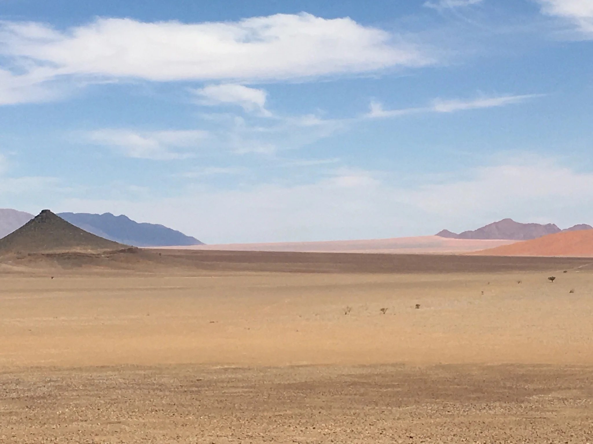 We spent about 5 hours in our 4×4 driven by our guide, not the kind of driving that can be done by someone not very experienced in navigating and safely traversing the vast expanse of sand seas. While the sand waves are the predominant feature there were occasional flatter portions of land with some scrub bushes and plants, particularly the !Nara plant which was the most important plant of the San as well as of many of the local peoples. The ! preceding the name indicates that it said with an initial click, a feature of many of the local languages which are filled with a variety of spoken clicks. Nara or Acanthosicyos horridus is an unusual melon that occurs only in Namibia. The nara plant is leafless, the modified stems and spines serve as the photosynthetic “organs” of the plant and the edible seeds are known locally as butterpips. The fruit serves as an essential food source and medicine for many people and animals from February to April and August to September. Because the plant is spiny many small animals shelter within its branches and the locals claim that any animal whose diet includes the plant is free from ticks and parasites. In these shrubby areas we saw oryx and some small jackals as well as ground squirrels and a very tiny gecko, completely transparent that lives in the sand with huge eyes without lids that the gecko must clean with his tongue. A really fascinating area.