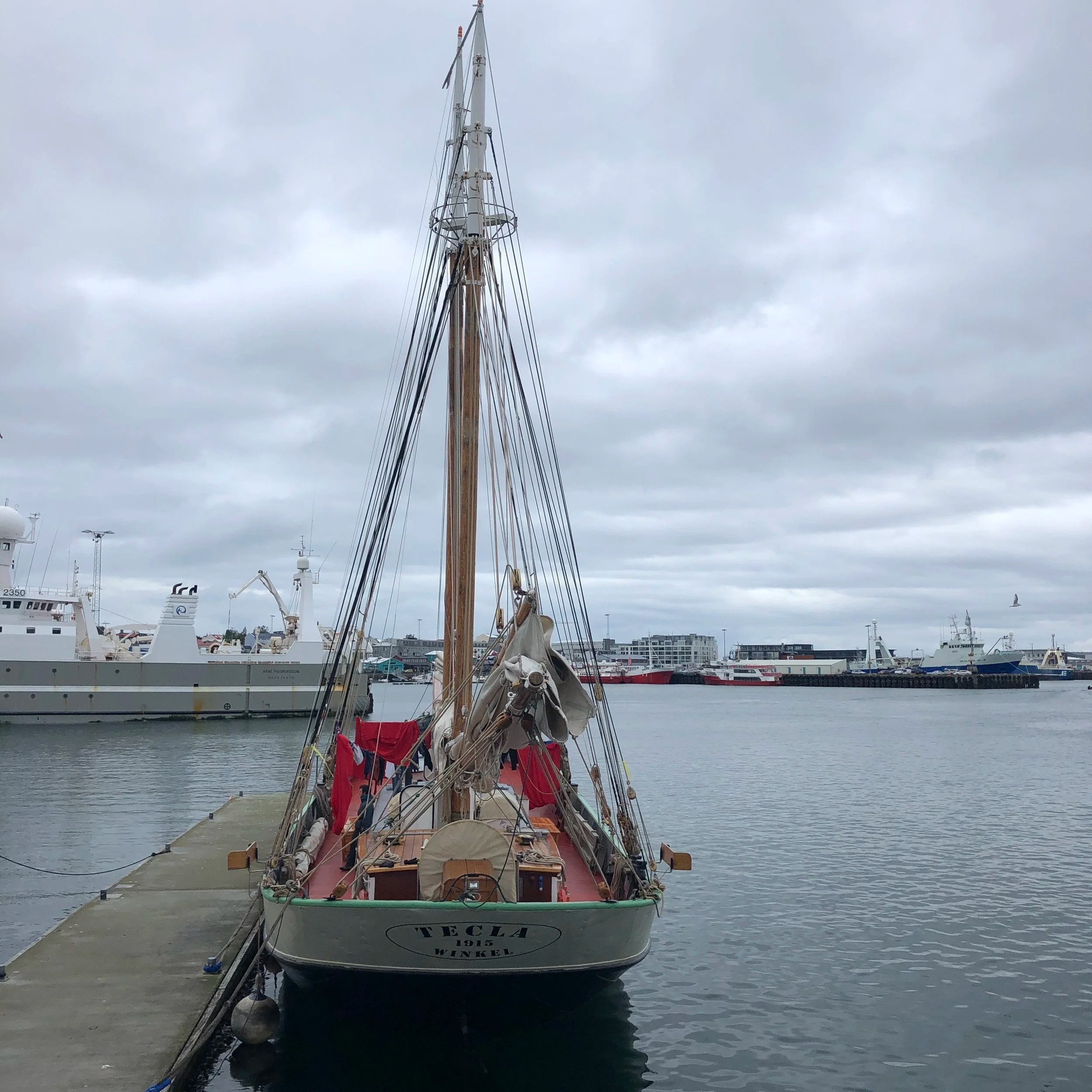 Spent my day in Reykjavik walking and re-finding familiar places. Having left Toronto in sun and 30 degrees, weather in Reykjavik windy, cold and rainy, great weather for walking however. There is a very interesting and helpful iphone app called MarineTraffic which allows you to find any registered vessel in the world, follow its track and see where it is at any moment in time. Using the app I discovered that my boat had docked, where it was moored, found its dock on Google Maps and walked there to get a look at where I’ll spending the next three weeks. Boat looked like a marine laundry as it got ready for tomorrow’s sail, bedding and blankets hanging from the rigging despite the rain, freshly washed and airing. Very much hope that the weather improves before tomorrow, wet sheets not welcome!