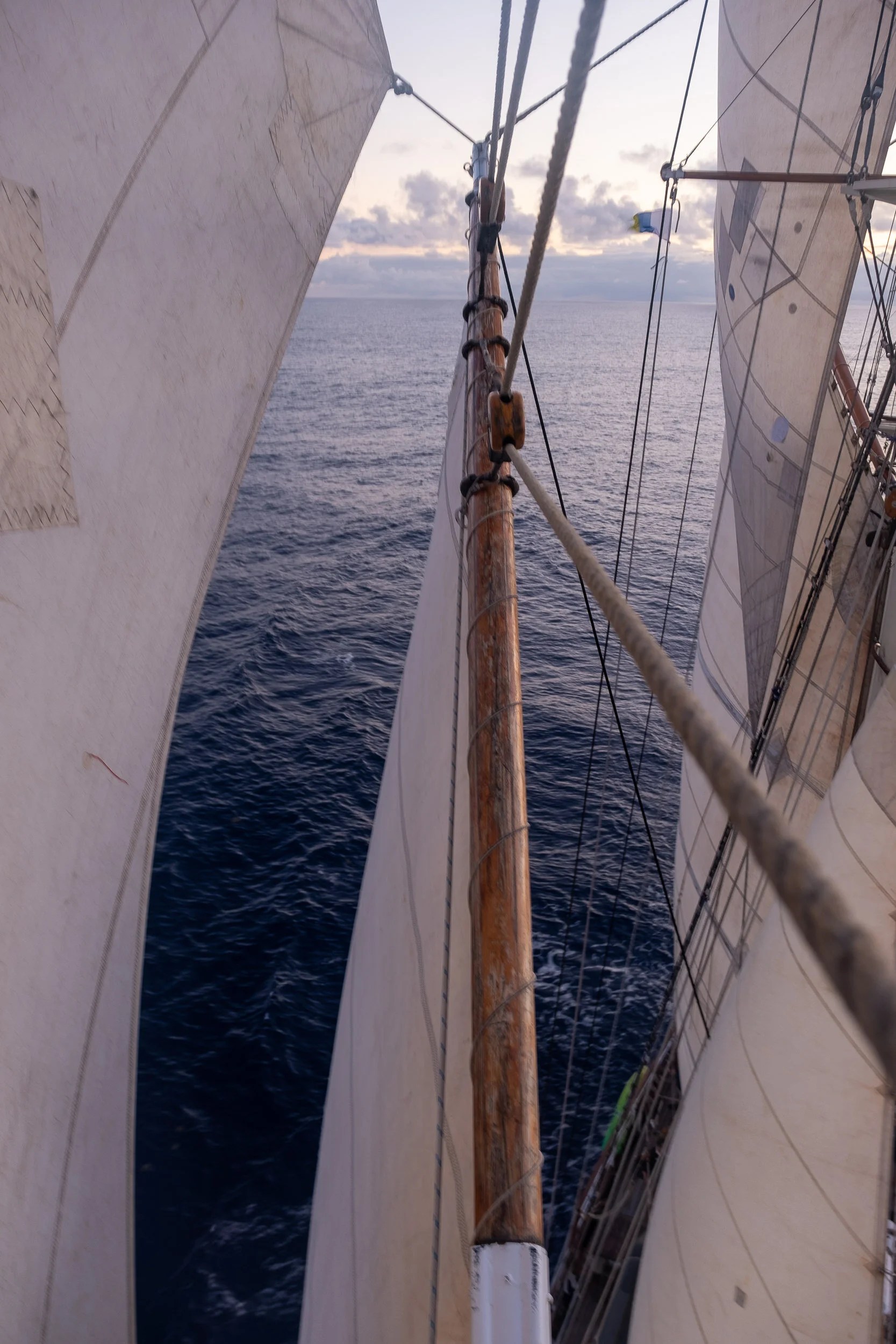 As you would expect, heavily reliant on rice, couscous and pasta and the vegetable kingdom’s longer lasting members, root veggies and cabbage as well as eggs and chicken which lasted quite well in the fridge, powered by a generator which ran for virtually the whole passage. Breakfast was oatmeal and fresh bread baked every day by Ruth, our chef, who I believe was the bravest member of our crew. Why, you ask? Ruth and her partner Jennie who looked after hospitality and food service, made the decision to sign on for the trip to try it out and see if they enjoyed it enough to make a career in sea-going hospitality. They were both charming young Scottish women but neither Ruth who had worked in a number of higher-end restaurants in London nor Jennie had ever sailed before. Additionally, the galley was in a deckhouse separate from the saloon where we dined and to reach it from the galley required a walk along the deck and up a couple of steps to a higher level of deck where the saloon was located. During the first part of the voyage when the winds were high and the seas were running, Ruth was up at 5am to make bread and prepare meals for 24 people while the ship was rolling 20 or 25 degrees and she was fighting her own battle with seasickness. She would gamely run to the leeward rail, be sick over the side and then run back to the galley to finish preparing meals, while large soup pots whose contents of very hot soup or stew splashed and tilted with every roll of the ship. This she did 3 times a day during the whole of that rough patch and we never missed a meal. And even when the meal was ready to serve the difficulties continued, as these large hot pots had to be carried from the galley along the deck to the saloon. Amazingly, even during the worst of the rolling and pitching, every pot arrived safely in spite of the fact that during the journey from the galley to the saloon there was no opportunity to reach out a hand to help keep balance as both hands were occupied with a very hot pot!