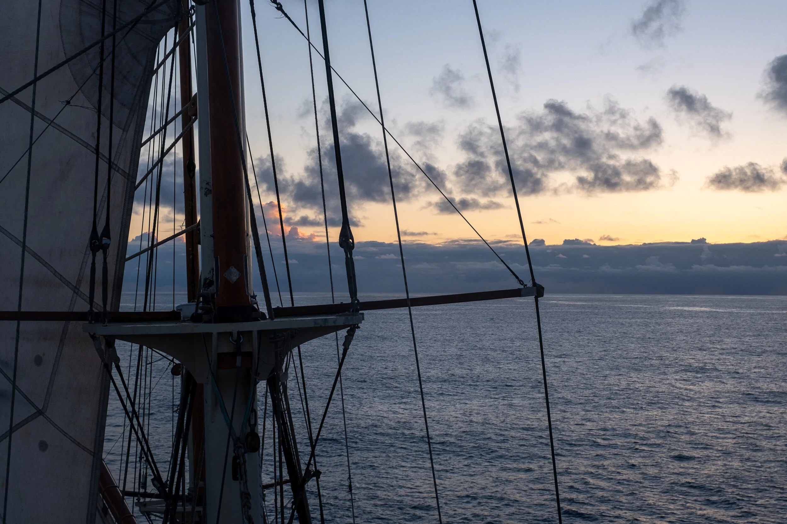 Nope, gaff-rigged tall ship and to qualify as a tall ship it needs to maintain a traditional rig, so blocks and lines on the masts and all the sails need to be raised by hand. As an aside, because it was a training ship, the trainee crew had a morning lecture on various technical aspects of sailing, sail handling and navigation. We, the voyage crew had a lecture at 1600 on similar topics. I loved this, since I had really wanted to learn more about navigation on the voyage, but we covered a variety of topics. As an example here are the 27 steps that are required to raise a sail on Blue Clipper. We worked our way through the steps in our lecture and then were given the 27 steps in jumbled order, our assignment for the next day was to put them in the proper sequence. Take a look and see what you think, all in the correct order?