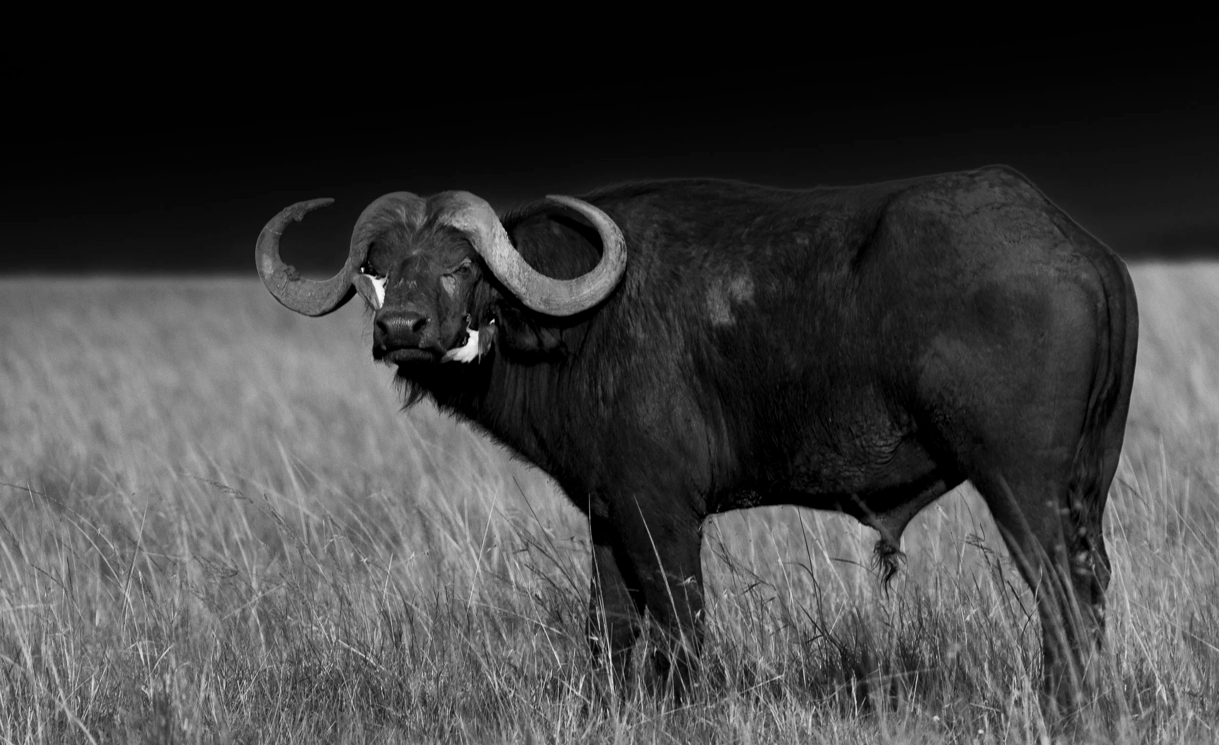 cape buffalo with oxpecker birds, masai mara, kenya
