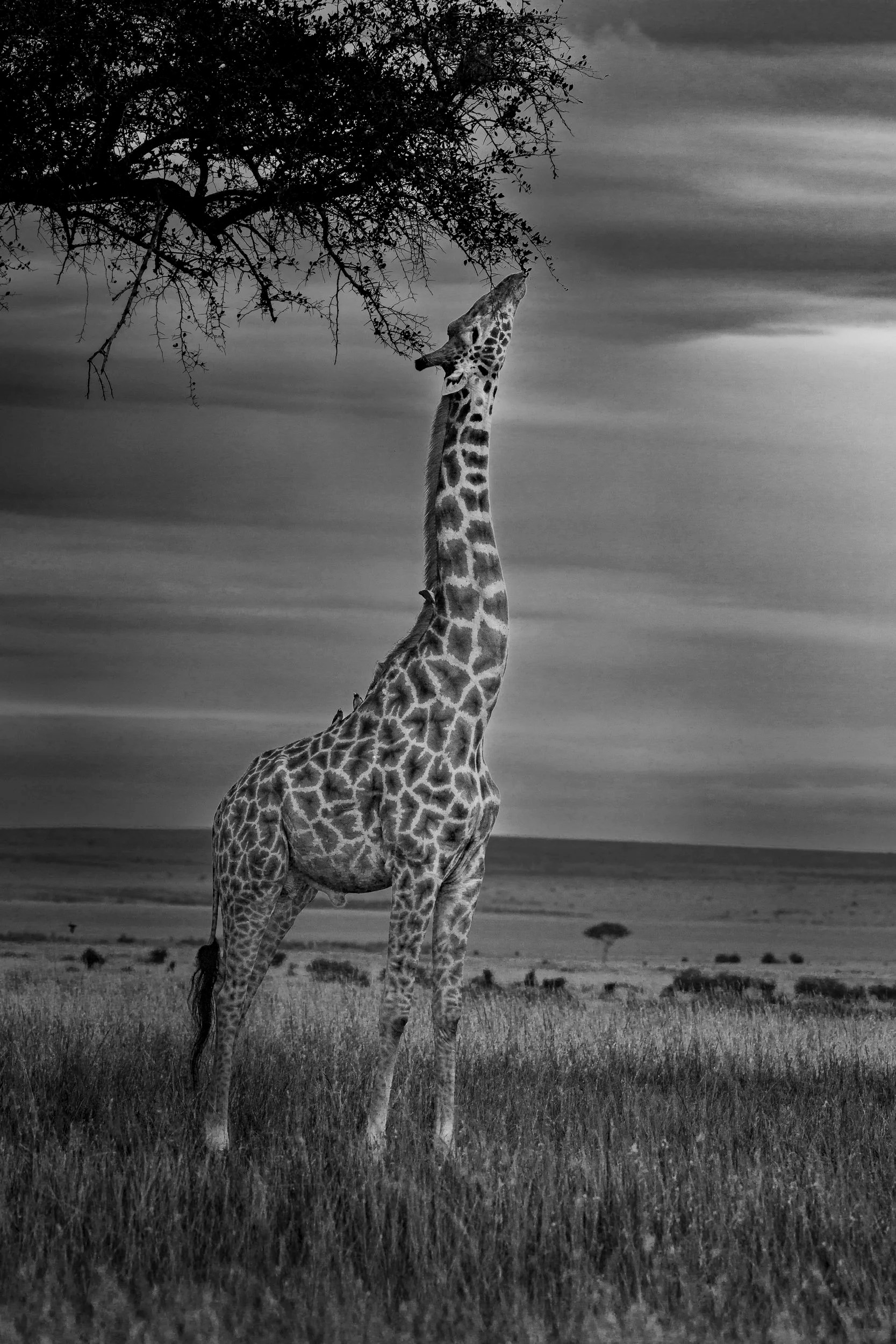giraffe with oxpecker birds, masai mara, kenya