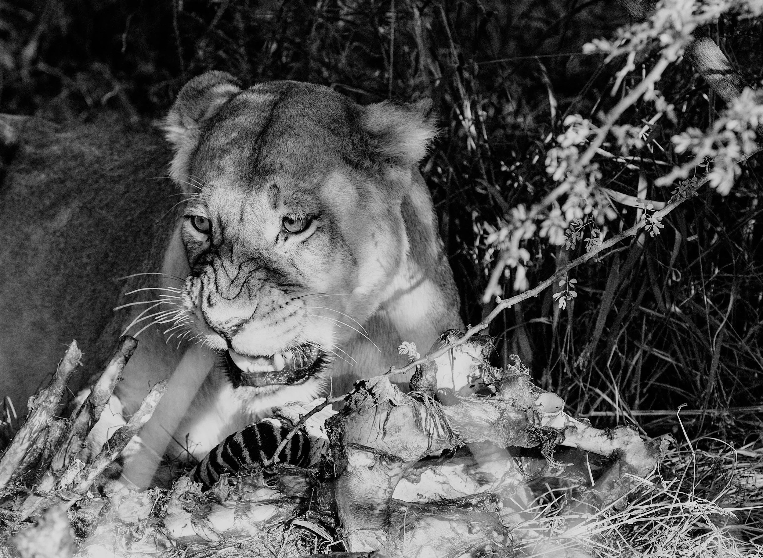 lioness defending her kill, tswalu, south africa
