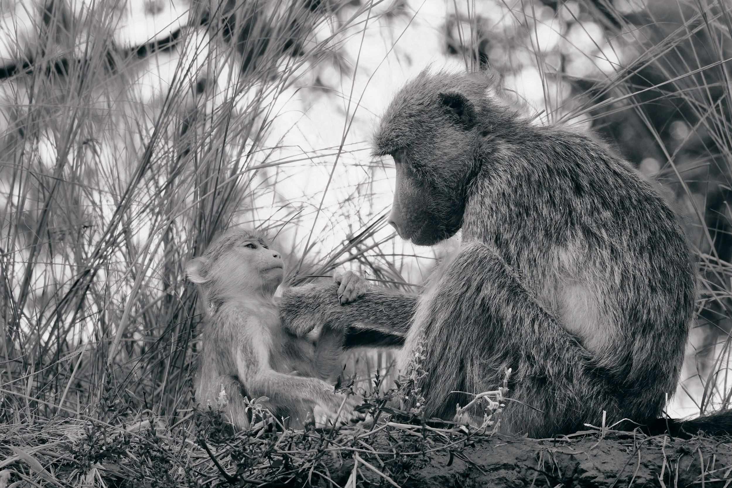 baboon mother and infant, zambezi river, zambia