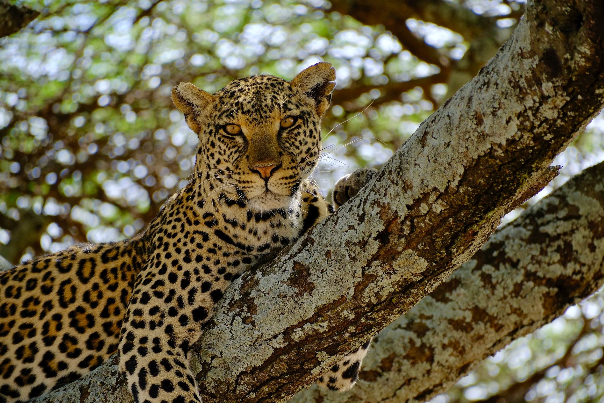 These winds have been ever-present and have continued to blow relentlessly since our arrival so our drive to the camp in an open vehicle yesterday and again on our first game drive this morning, were both punishing. Having said that, we are in a wonderful, remote portion of the Serengeti that has only recently been re-opened after a number of years being closed in order to re-build its cheetah population. Unlike the Masai Mara in Kenya which contains vast tracts of fairly open grasslands relieved by occasional acacia trees and scattered shrubs, the Serengeti is, in many places, an ocean of windswept grassland with virtually no no trees or low-lying vegitation. And wind-swept it is at the moment. However this hasn’t prevented us from having a sighting that in all of our previous 6 trips to Africa, has eluded us. We spent a happy hour this morning watching a female leopard on a tree limb about 3 or 4 metres over our heads. She had just fed and her stomach was bulging as she stretched herself out to relax and varied her time by lazily watching us or having an occasional nap. A magical moment and made even better by the primary reason for us having chosen this camp, not another vehicle in sight. Our camp is far removed from others and we only briefly saw one other vehicle for the entirety of our 6 hour drive.